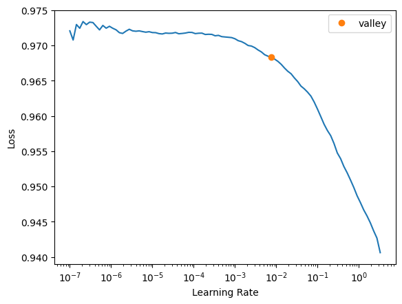 learn = Learner(dls, pytorch_model, loss_func=loss_func, opt_func=ranger, metrics=binary_dice_score)learn.lr_find()SuggestedLRs(valley=0.007585775572806597)