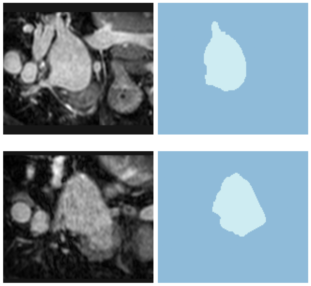 learn.load('heart-weights');test_dl = learn.dls.test_dl(test_df,with_labels=True)test_dl.show_batch(anatomical_plane=0, figsize=(10,10))