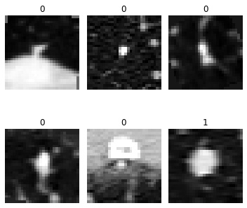 dls.show_batch(max_n=6, figsize=(5, 5), anatomical_plane=2)