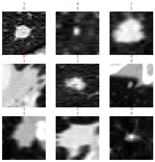 With the model trained, let’s look at some predictions on the validation data. The show_results method plots instances, their target values, and their corresponding predictions from the model.